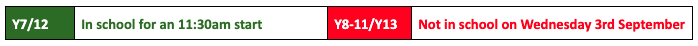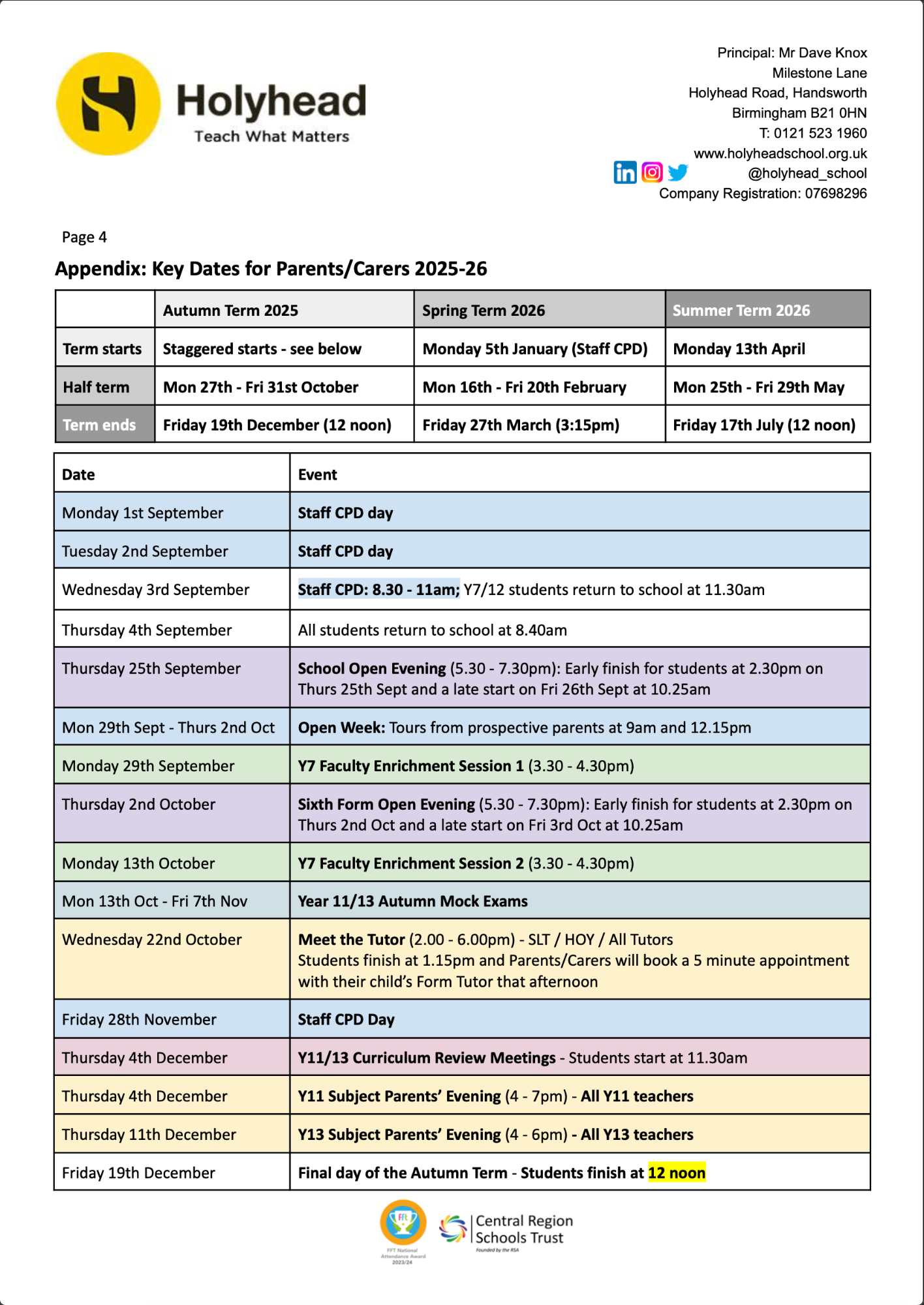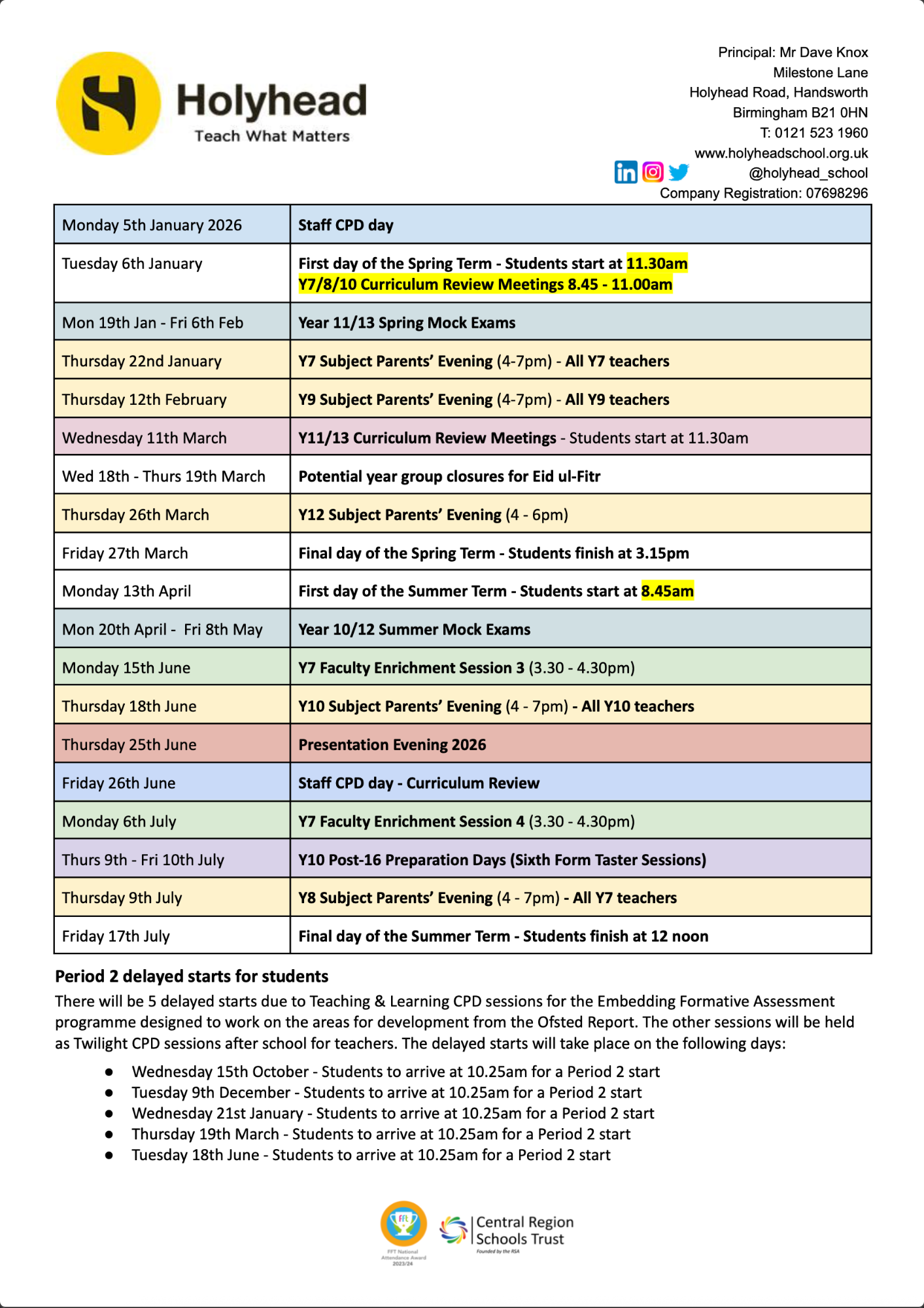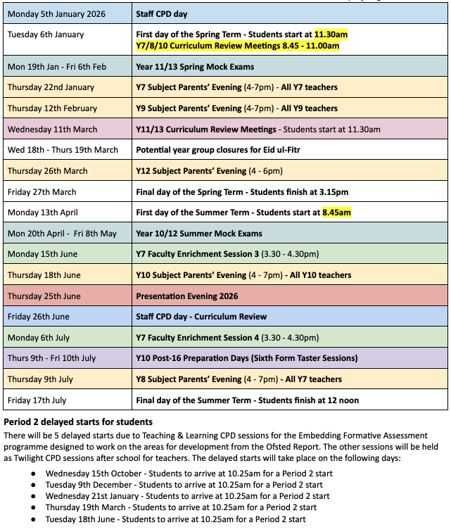 - Delayed start at 10.25am on Wednesday 15th October for Teaching Staff CPD on Ofsted areas for improvement focused on the Embedding Formative Assessment programme (Y11 students to arrive at normal time for their GCSE Maths Mock exam at 8.45am)