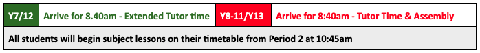 The first delayed start is on Wednesday 15th October. Students should arrive from 10:10am for a Period 2 start with all students being on site for 10.25am. Breakfast Club will run as normal for students on site from 10:10am.
