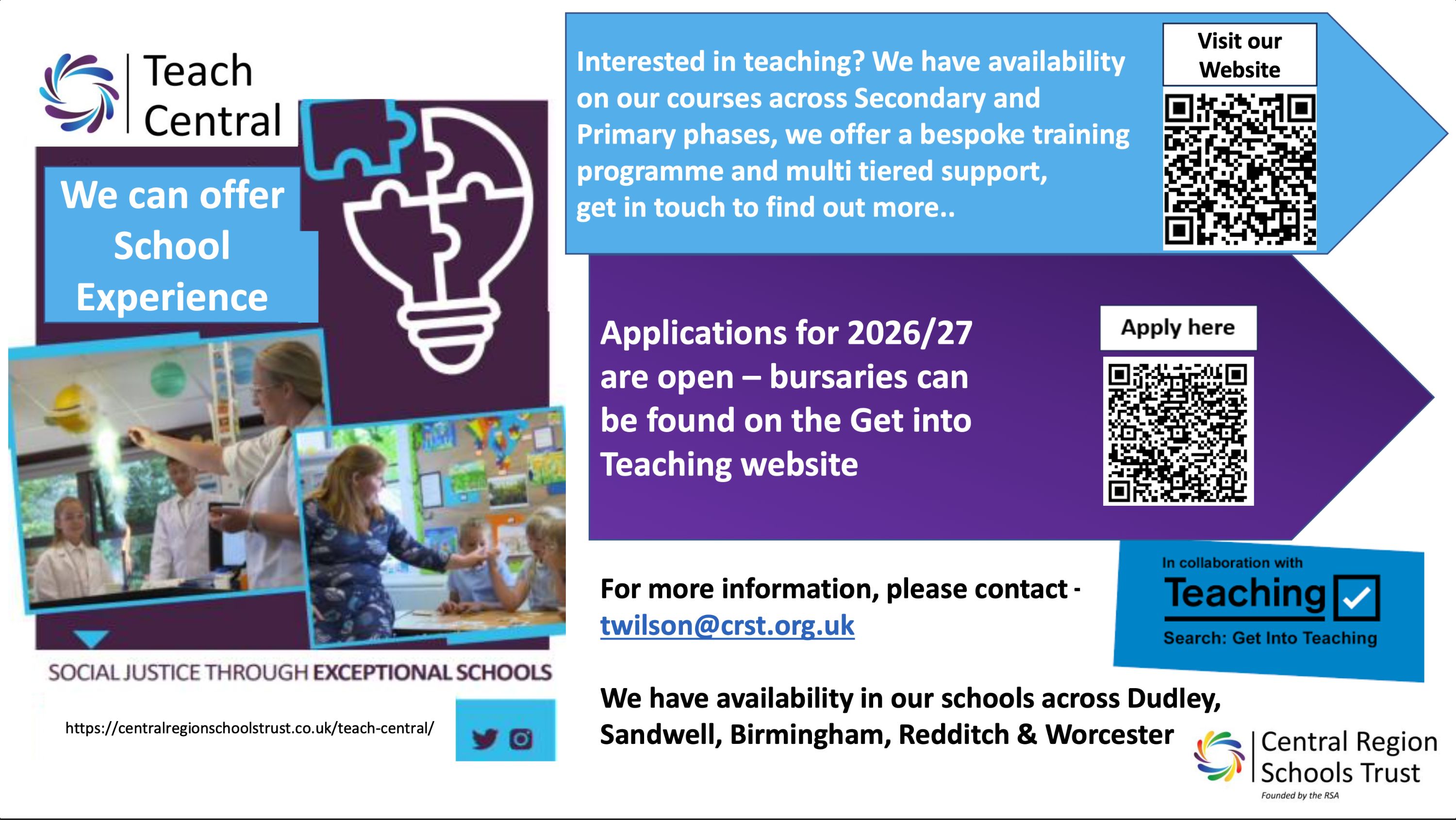 We offer a range of School Direct programmes (including Secondary salaried and training routes and for Primary there are four training route options) This allows CRST schools the opportunity to further enhance our teacher training provision. We have developed new, exciting, innovative programmes with highly regarded local Higher Education Institutes.