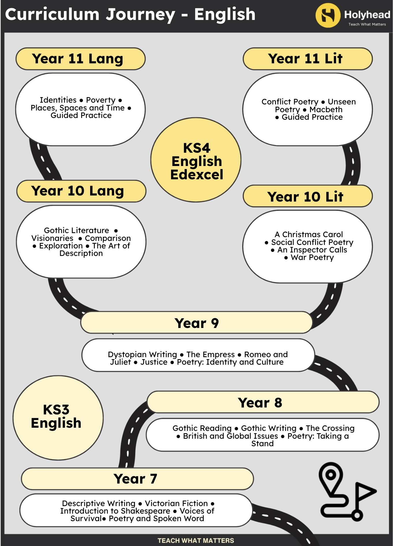 The English Faculty at Holyhead uses this perspective to develop student's own view of the world through a range of multimodal texts and the Literary canon. We aim to present out students with a diverse range of authorial voices that represent the demographic of Handsworth, while keeping in line with the National Curriculum. We aspire to enable individual voice in a multifaceted world where morality and ethics are debated and scrutinised, thus developing the ethical mind and the moral character of every learner at Holyhead School. Holyhead English serves the local community in this way to ensure that the future of the local community is bright, ambitious and progressive.